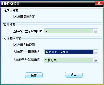 1.在软件的系统设置里,找到外界设备设置,启用人脸识别,同时设置采集的摄像头和比较方案。